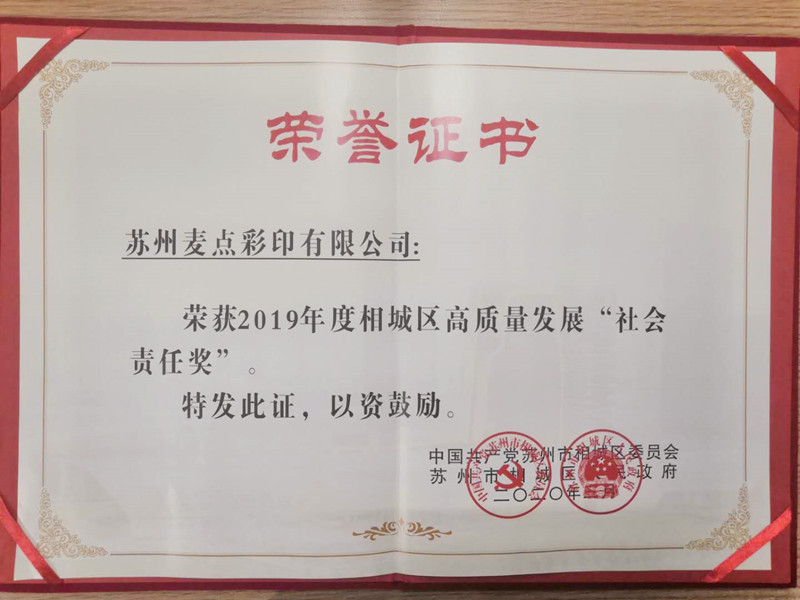 日前,相城區(qū)2019年度高質(zhì)量發(fā)展綜合考核表彰暨作風(fēng)建設(shè)大會(huì)召開(kāi),蘇州市麥點(diǎn)彩印有限公司憑借多年來(lái)在履行企業(yè)社會(huì)責(zé)任方面的突出貢獻(xiàn),榮獲相城區(qū)2019年度高質(zhì)量發(fā)展“社會(huì)責(zé)任獎(jiǎng)”。